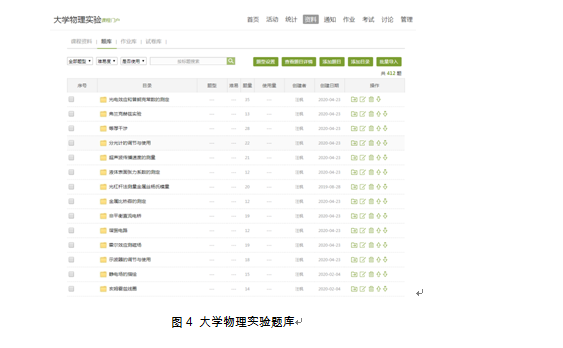 “两个落实”,即落实教学反馈和落实评价机制。学习的主体虽然是学生,但教师依然需要扮演好“导、疏”的角色,必要的学习反馈是教师在屏幕另一端掌握学生学习状态并开展下一阶段任务布置的重要指标,而其中最直观也是最高效的反馈途径就是习题。因此,题库的建设尤为重要。大学物理实验团队教师利用两周的时间,通过线上讨论和分工协作,每人完成了两项实验项目的题库建设工作,并经过反复讨论修改,最终敲定。