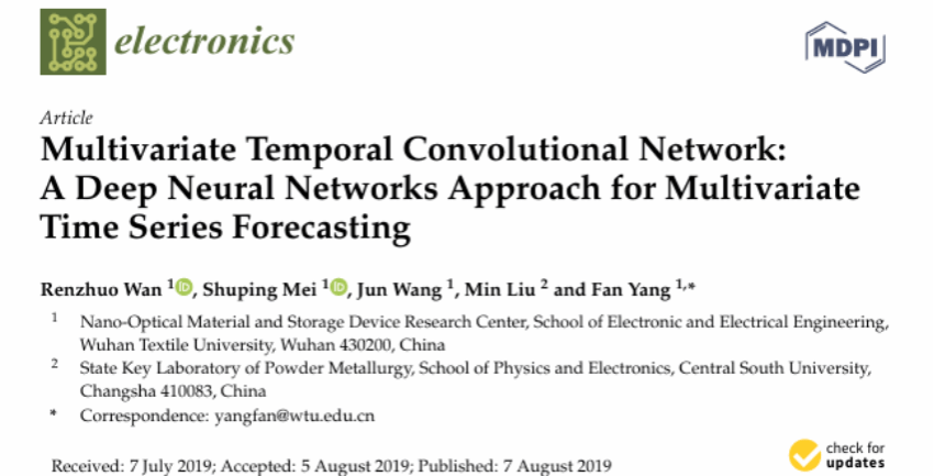 根据Essential Science Indicators(简称ESI)最新数据显示,我校天下娱乐 万仁卓教授团队发表在国际学术期刊《Electronics》上的研究论文《Multivariate Temporal Convolutional Network: A Deep Neural Networks Approach for Multivariate Time Series Forecasting》(Electronics 2019, 8(8), 876)成功入选工程学科领域ESI全球前1%高被引论文。论文第一作者为万仁卓教授,通讯作者为杨帆副教授,武汉纺织大学为第一通讯单位。