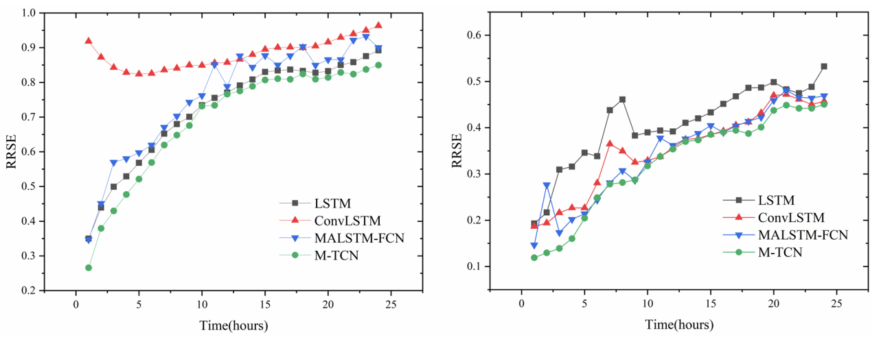 该模型在Beijing-PM2.5 数据集和 ISO-NE 数据集进行实验验证。对比实验结果显示,在与长短期记忆网络(LSTM)、卷积长短期记忆网络(ConvLSTM)等多种传统和深度学习模型的对比中,M-TCN 模型表现优异,在两个数据集上的预测精度比 LSTM 和 MALSTM-FCN 等模型高出约10%-20%,且在长期预测中 RRSE 保持稳定增长,波动较小。