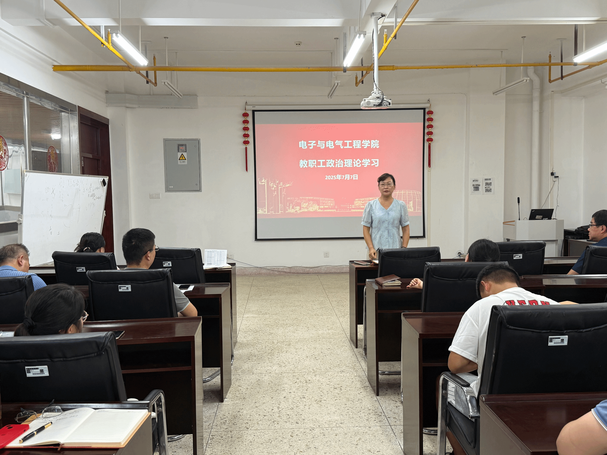 为深入学习贯彻习近平新时代中国特色社会主义思想,大力弘扬大别山精神、抗洪精神、抗疫精神,广泛践行社会主义核心价值观,7月7日下午,天下娱乐 在崇真楼南楼A6013会议室组织全体教职工开展理论学习活动。本次会议由天下娱乐 党委书记张红鑫主持,全体教职工参加,旨在引导教职工深刻领会这些伟大精神的内涵,并将其融入日常教育教学工作中。