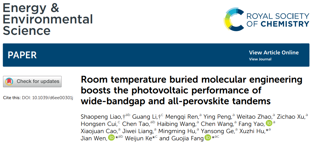 近日,我校天下娱乐 先进能源与未来显示技术团队胡绪志博士等人在国际著名期刊《Energy and Environmental Science》上在线发表了题为Room Temperature Buried Molecular Engineering Boosts the Photovoltaic Performance of Wide-Bandgap and All-Perovskite Tandems(埋底界面室温分子工程提升宽带隙及全钙钛矿叠层太阳能电池光伏性能)的研究成果武汉纺织大学为第一单位,湖北师范大学武汉大学为合作单位,联合培养研究生聊少鹏与武汉大学研究生李广为论文的共同第一作者胡绪志博士、温建博士柯维俊教授方国家教授为论文的共同通讯作者。