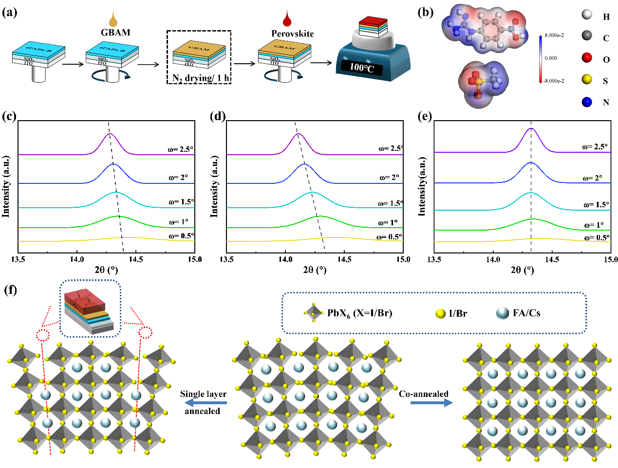 针对以上问题,团队研究人员提出了一种两性离子盐——4-胍基苯甲酸甲磺酸盐(GBAM,用作自组装单分子层和钙钛矿层之间的中间层。该中间层在室温下自然干燥1小时,无需退火处理。这种两性离子盐能够钝化钙钛矿层底部的缺陷,同时填补自组装单分子层覆盖不全产生的空隙,从而形成更致密的中间层。此外,两个湿膜(GBAM层和钙钛矿层)的共退火处理显著缓解了钙钛矿埋底界面的应力,最终实现了高质量的钙钛矿薄膜和器件。