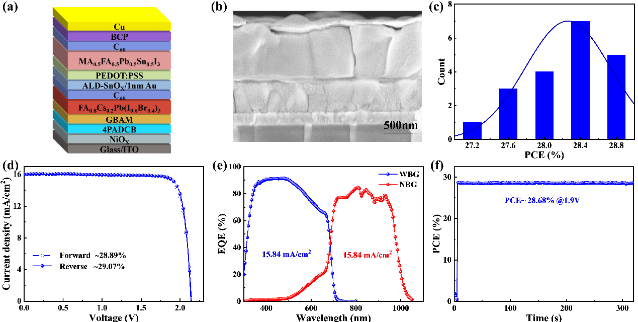 通过采用这种室温湿膜法,研究人员开发了一种带隙为1.78 eVp-i-n结构宽带隙钙钛矿太阳能电池,实现了20.9%的光电转换效率单结宽带隙钙钛矿太阳能电池为基础,成功制备了两端全钙钛矿叠层太阳能电池,实现了29.1%的光电转换效率。