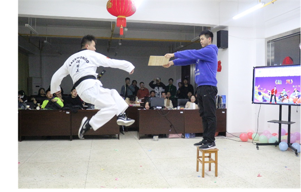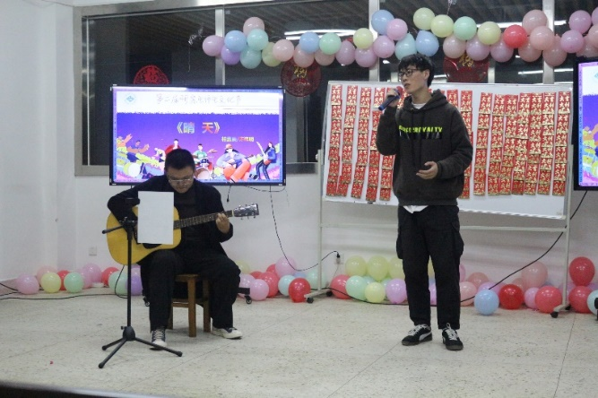 晚会在王煜明同学的歌唱节目《孤勇者》中拉开帷幕;陈祎明、柏嘉庚两位同学带来了吉他弹唱节目《晴天》,两位同学配合默契,弹者熟练、唱者深情;朱登玉同学的跆拳道节目《跆风》展现了天下娱乐