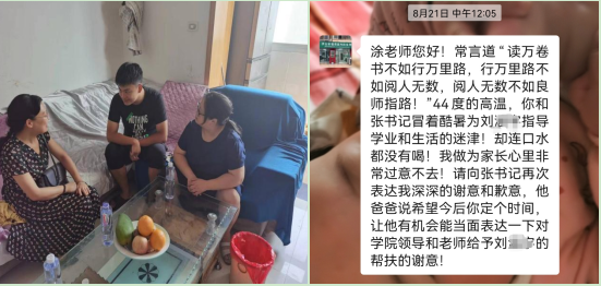 领导老师的到来十分高兴。家长说,没想到老师还能冒雨看望他们,并希望小刘以后能多向老师请教和学习,珍惜大学时光,发愤图强,积极进取,不要辜负老师和家长的期望。