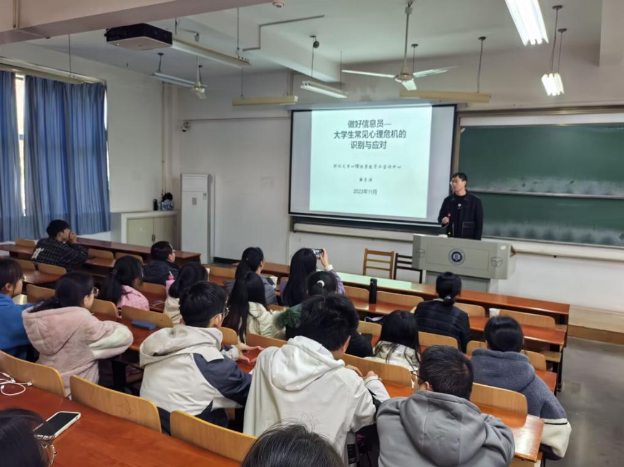 首先,黄老师以“做好信息员——大学生常见心理危机的识别与应对”为题,分别从抑郁症的症状、及时报告心理危机的重要性、其他心理异常疾病、心理危机事件的诱因、遇到危机怎么做五个方面的内容,详细系统的介绍了心理危机的识别和应对。
