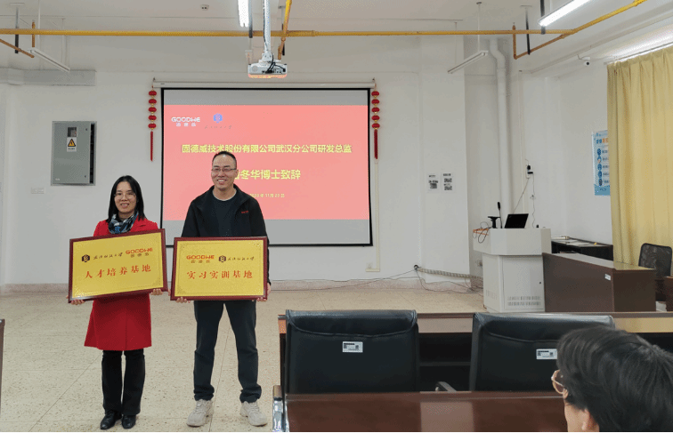 与固德威公司还举行了实习实训基地揭牌仪式,副院长韩谷静教授、固德威公司研发总监潘冬华博士分别作了热情洋溢的致辞,鼓励同学们充分利用好实习实训基地,投身实践,提高自己的专业能力。