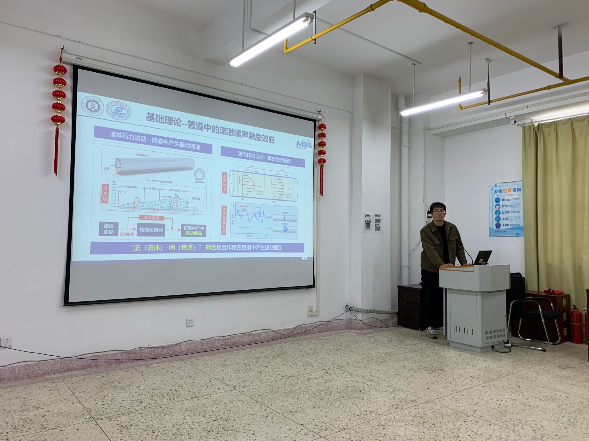 闫宝强博士作了题为“基于分布式声波传感的管道检测技术与应用”的报告,项目以光纤应用到刚性管道为研究对象,重点解决压力管道腐蚀缺陷对多点流激噪声的声学影响规律和压力管道缺陷声场与探测激光的全时程耦合机理等关键科学问题,以实现对管道情况进行灵敏检测。在交流讨论环节中,闫宝强博士与在座老师围绕柔性管道能否实现应用和工程问题等展开了深入讨论。