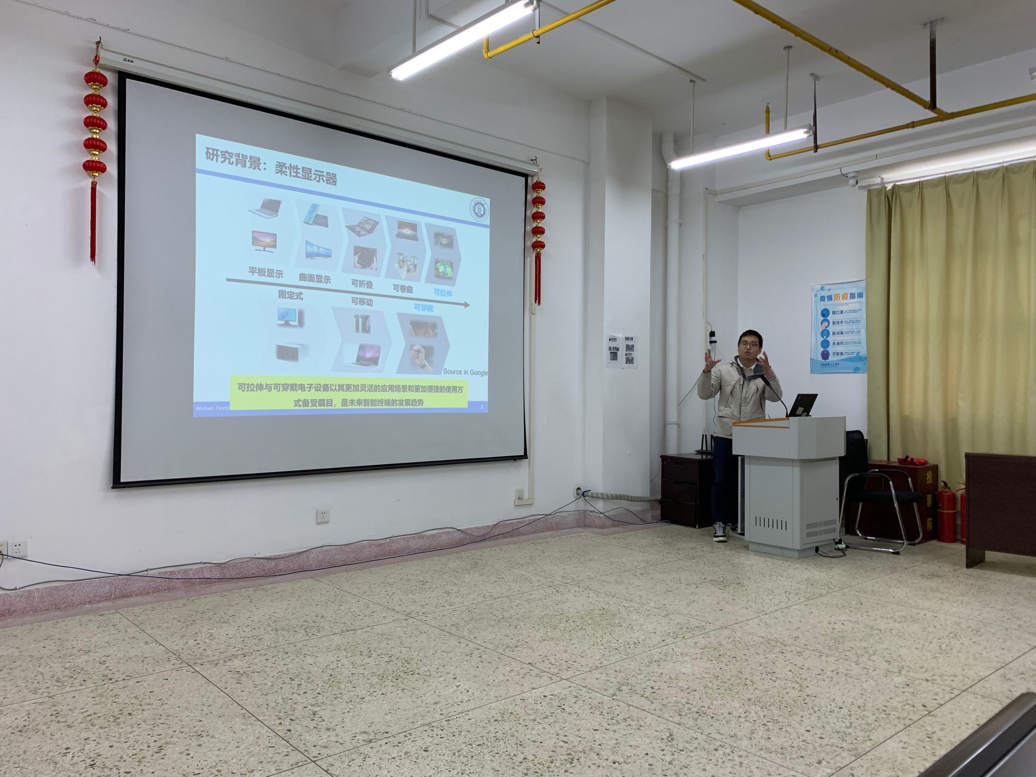 刘广友博士作了题为“反射-发光双模式纤维显示的器件构筑及其柔性形变下显示机理研究”的报告,项目以柔性设备为研究背景,说明可拉伸与可穿戴电子设备是未来智能终端的发展趋势,围绕纤维显示的柔性形变下显示机理研究展开。在交流讨论环节中,刘广友博士与在座老师围绕课题名称、柔性智能设备制造和关键科学问题等展开了深入讨论。