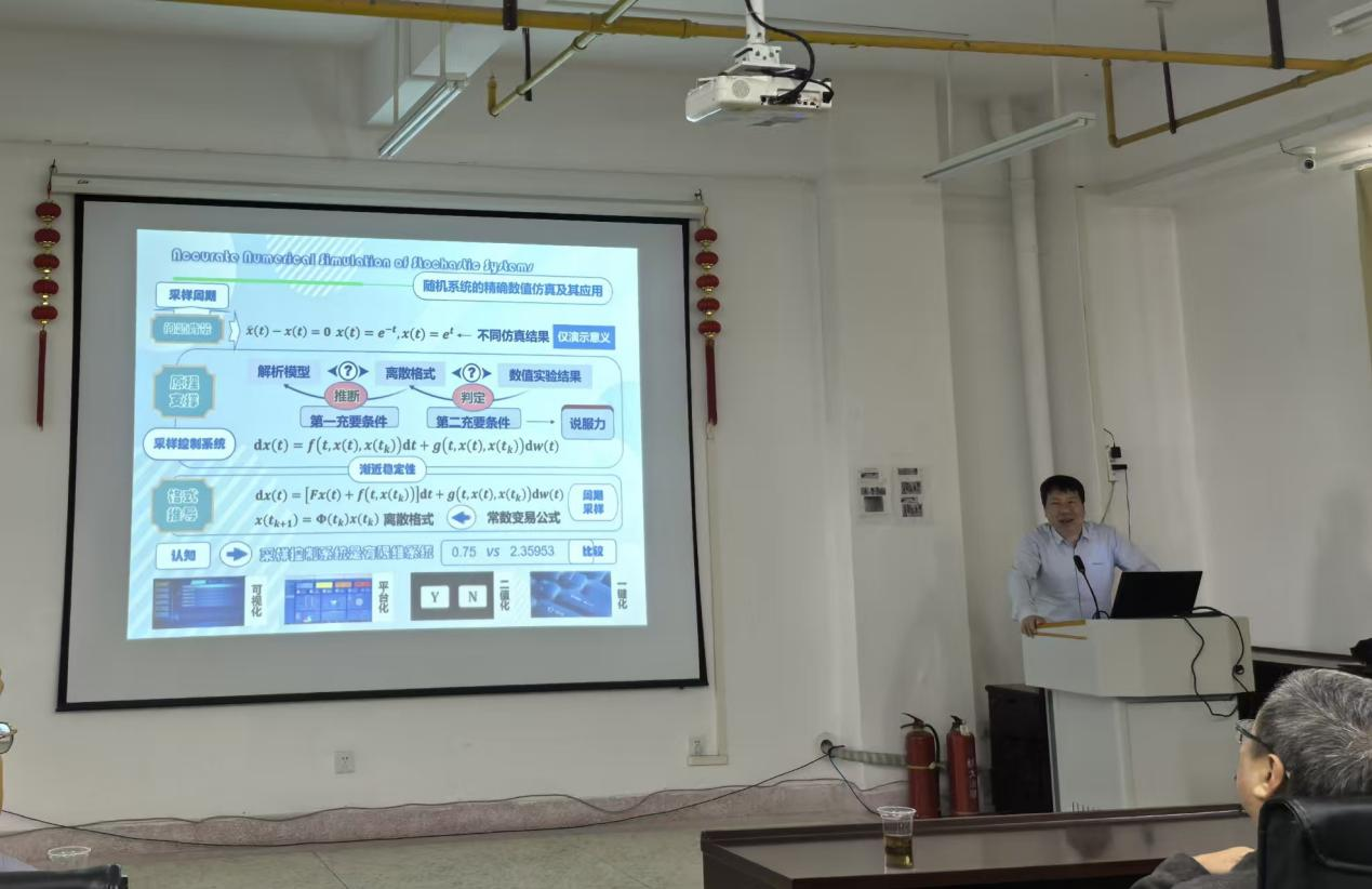 沙龙由邓飞其教授和金鹏老师担任主讲嘉宾。邓飞其教授以《滞后随机系统的建模、分析、数值仿真及其应用》为题,系统阐述了具有滞后效应与随机干扰的复杂系统理论,并结合实际应用场景,展示了其研究的前沿价值与实用意义。