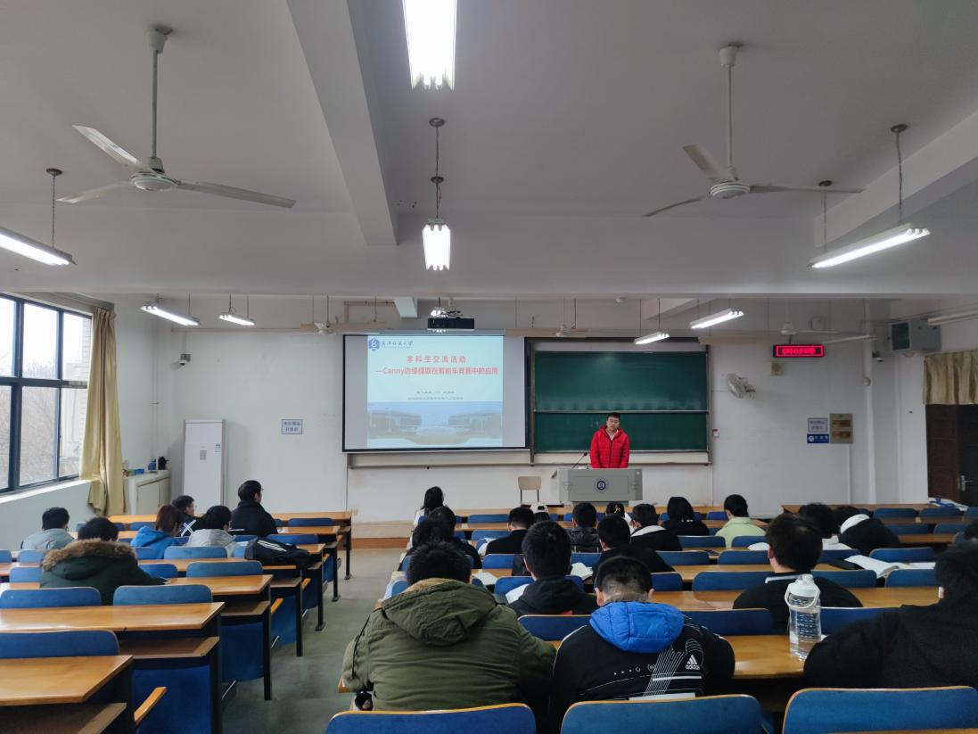 张明老师首先进行开场致辞和讲者介绍。随后,电气卓越11901班李国庆同学走上讲台,作了题为《Canny边缘提取在智能车竞赛中的应用》的学术报告,重点介绍了Canny边缘提取算法在智能车视觉导航的应用,结合自己今年参加第十六届全国大学生智能汽车竞赛华南赛区比赛经历,就如何准备比赛做了详细介绍,以及自己参赛的心得体会和经验教训,并回答了一些同学们的提问。