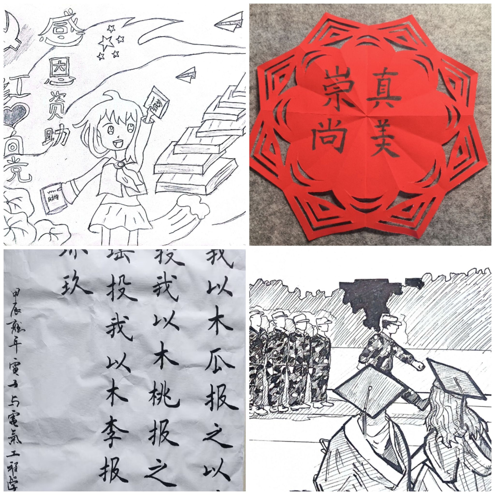 2024年6月7日—22日举办了“心怀感恩,与爱同行”书画作品征集活动,50余名爱好手绘和书法的同学参与本次活动。同学们通过写写画画记录下美好记忆,进一步领悟到艺术的无穷魅力,传承和弘扬传统的国粹文化艺术,既为绘画和书法爱好者提供一个展现自我的平台,又有助于促进同学们对助学、诚信、感恩更深层次的理解。