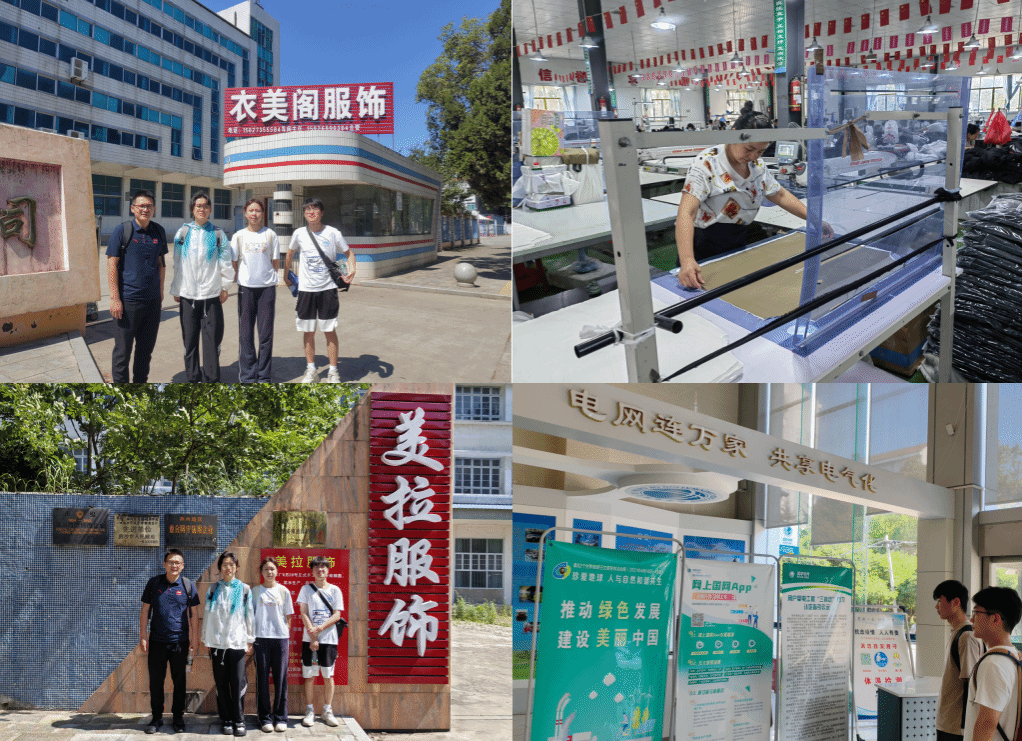 接着,实践团实地调研了国家电网潜江市供电公司和熊口镇纺织企业。团队成员走进国网潜江市供电公司,了解了企业的发展,以及负责区域内电网规划、建设、调度、运行及电力营销等业务工作,承担着潜江市域各区镇街道的电力供应任务。团队来到衣美阁服饰厂,走进企业车间,实地走访了生产线,进一步了解了面料的裁剪、缝制、装配,每一道工序都展现着他们高超的技艺和严谨的态度。和企业负责人交流,了解到该企业是乡镇企业,规模虽然不是很大,但带动了部分就业岗位,满足了当地部分的岗位需求。随后,实践团队还调研了美拉服饰、一北服饰等。