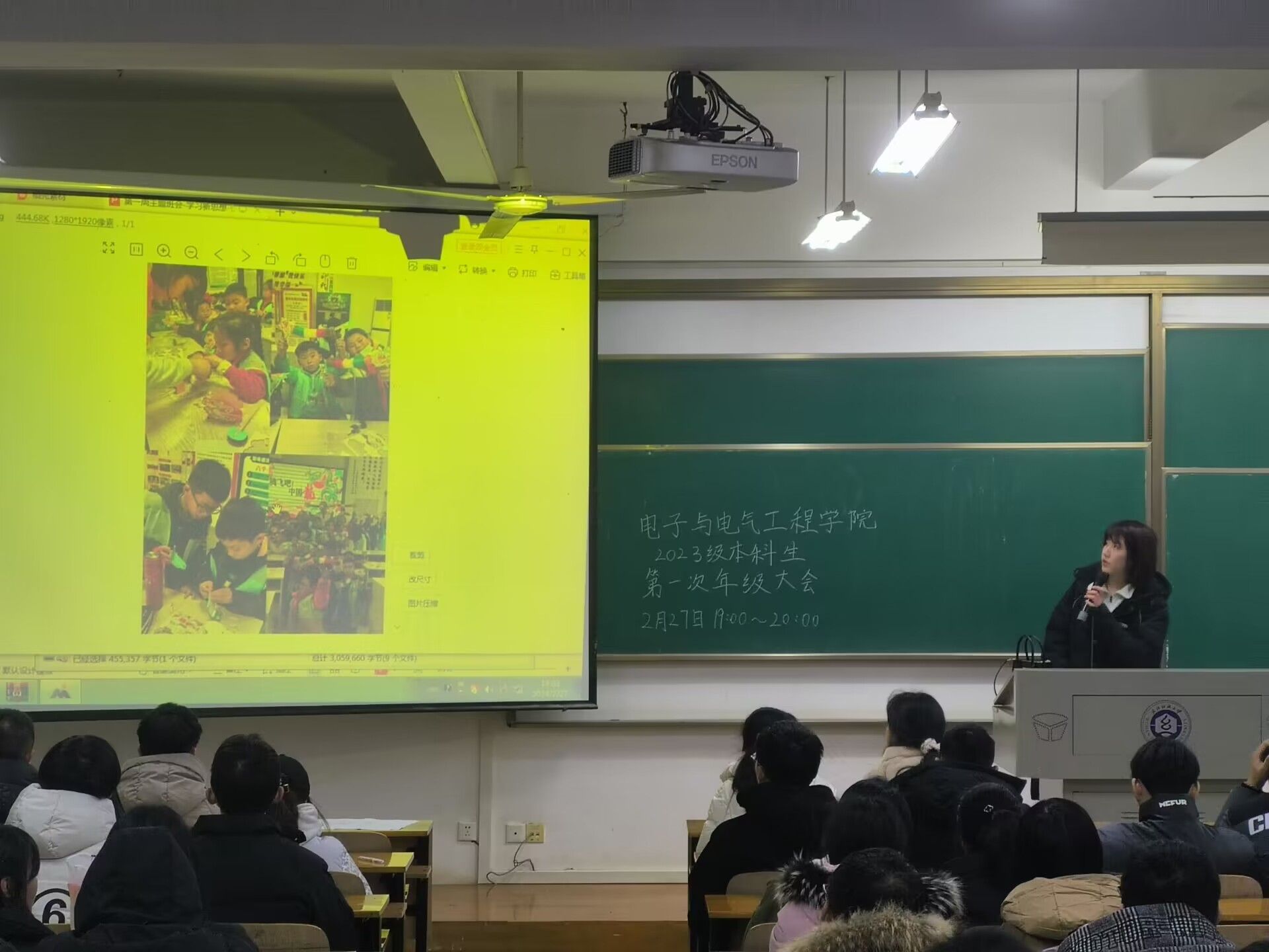 2023级本科生在6号教学楼召开了新学期第一次年级大会,会议由辅导员陈珍老师主持,全体23级本科生参与。