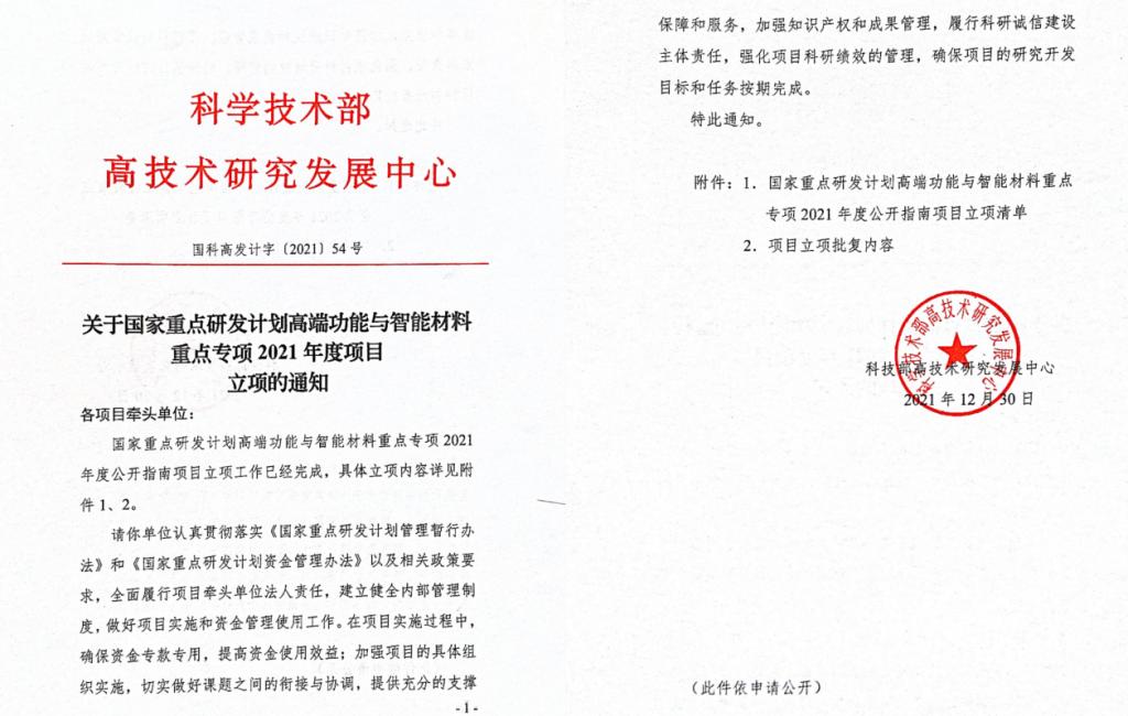 国家重点研发计划由原来的国家重点基础研究发展计划(973计划)、国家高技术研究发展计划(863计划)、国家科技支撑计划、国际科技合作与交流专项、产业技术研究与开发基金和公益性行业科研专项等整合而成。为落实“十四五”期间国家科技创新有关部署安排,“高端功能与智能材料”重点专项的总体目标是以国家重大需求为导向,支撑新一代信息技术、智能制造、新能源、现代交通、深海/深空/深地探测等重要领域的发展,补短板与建优势并举,解决高端功能与智能材料的重大基础原理、核心制备技术与工程化应用等关键问题。