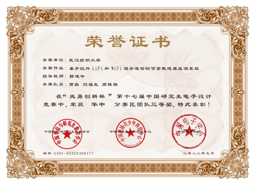 天下娱乐 “通信与智能信息处理实验室”郭建中老师指导的参赛作品《基于红外LiFi和WiFi混合通信的可穿戴健康监测系统》,获得“兆易创新杯”第十七届中国研究生电子设计竞赛”华中赛区三等奖。